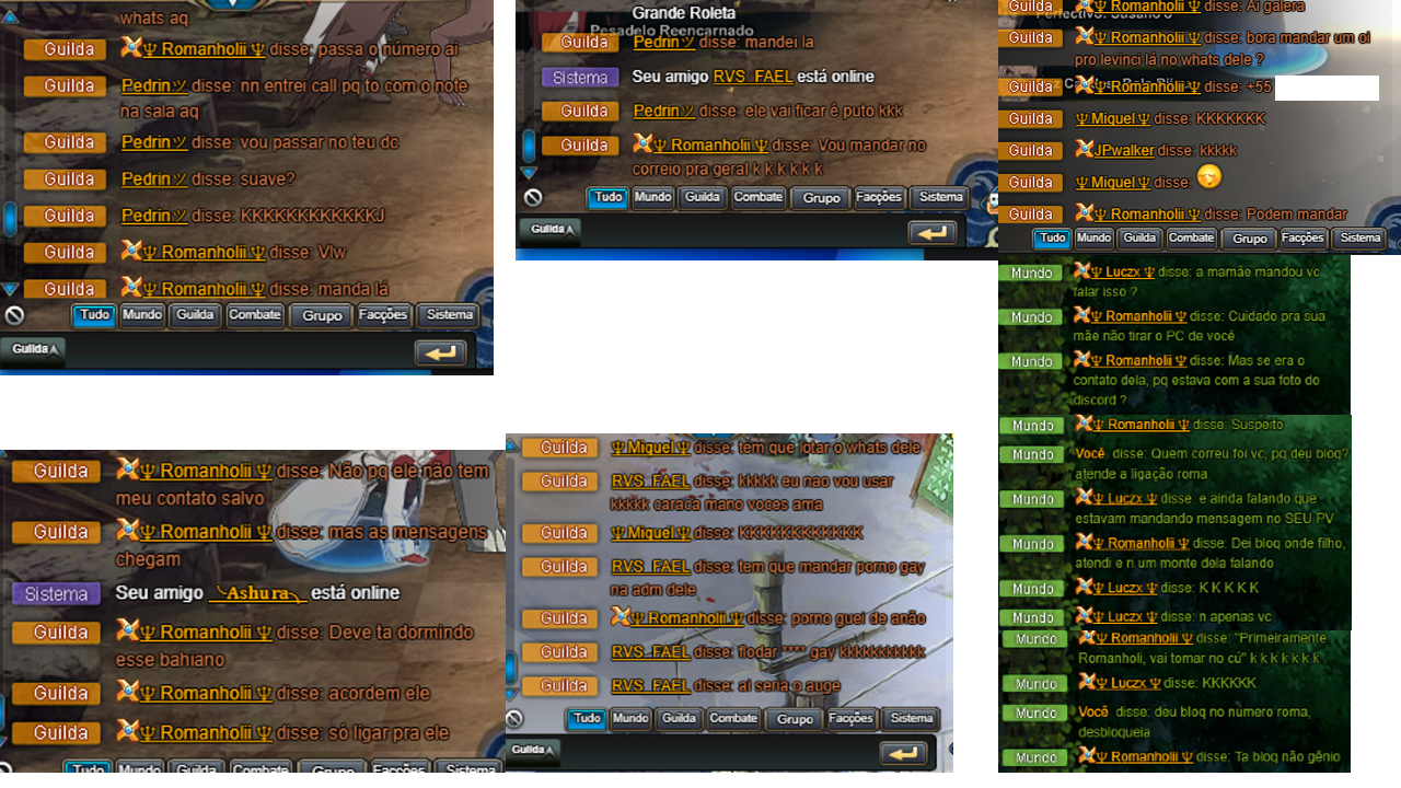Jogadores membros da guilda Night Raid, orientados pelo Romanholii, praticaram injuria, difamação, xenofobia, xingamentos contra minha mãe e indicativos de homofobia contra mim, hoje, dia 15/01/2024 por volta das 20h. O jogador Pedrin mandou meu número pessoal para os membros da guilda sem me consultar e sem minha permissão. Eles organizaram um ataque com ofensas e palavras pejorativas contra mim, como comprovam os prints. Peço atenção total da gerência da Oasis Games e penalidades aos envolvidos, pois violaram a conduta e respeito.